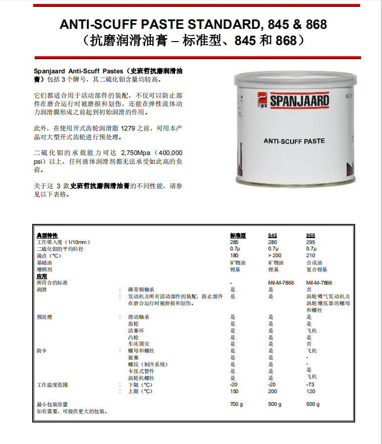 • 型號:???Anti-Scuff Pastes史班哲二硫化鉬抗磨潤滑油膏